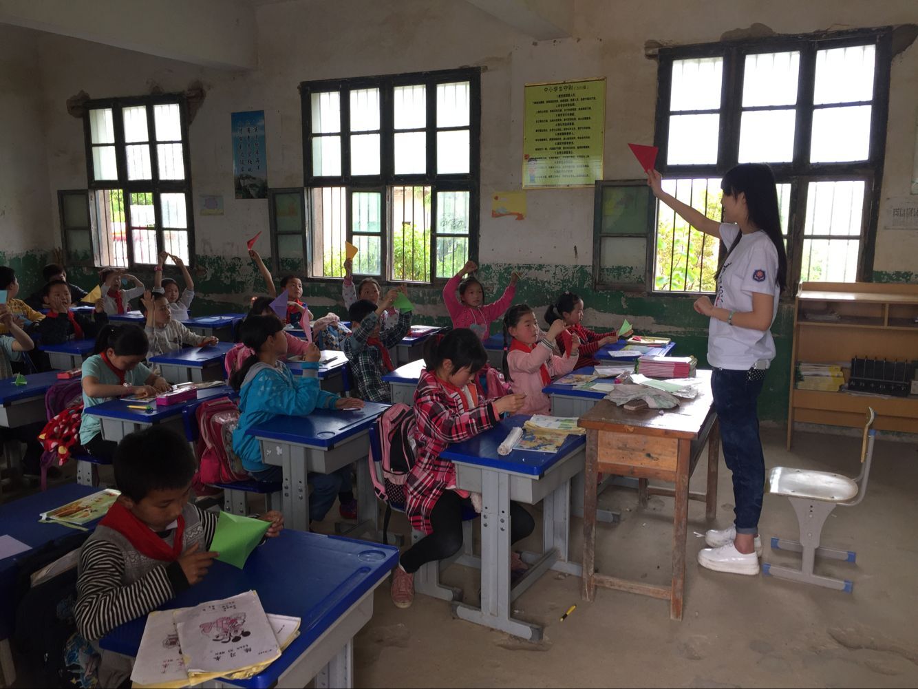 武汉学院的这支助教队伍由会计及金融学院分团委书记樊丽娟、学生服务办副主任何小鹏、辅导员傅筱倩等3位老师及13名志愿者组成。志愿者们把带去的教学文具和少儿图书赠送给了三畈小学的孩子们。在分发完教学物资后,助教队伍按计划开展相关教学任务,短短一天内,在领队老师的组织和领导下,志愿者们充分展现出自己的才干,进行了音乐、美术、折纸艺术、语文、数字等多门课程的教学,大家都希望通过此次活动可以带给山区的孩子们多一点快乐。