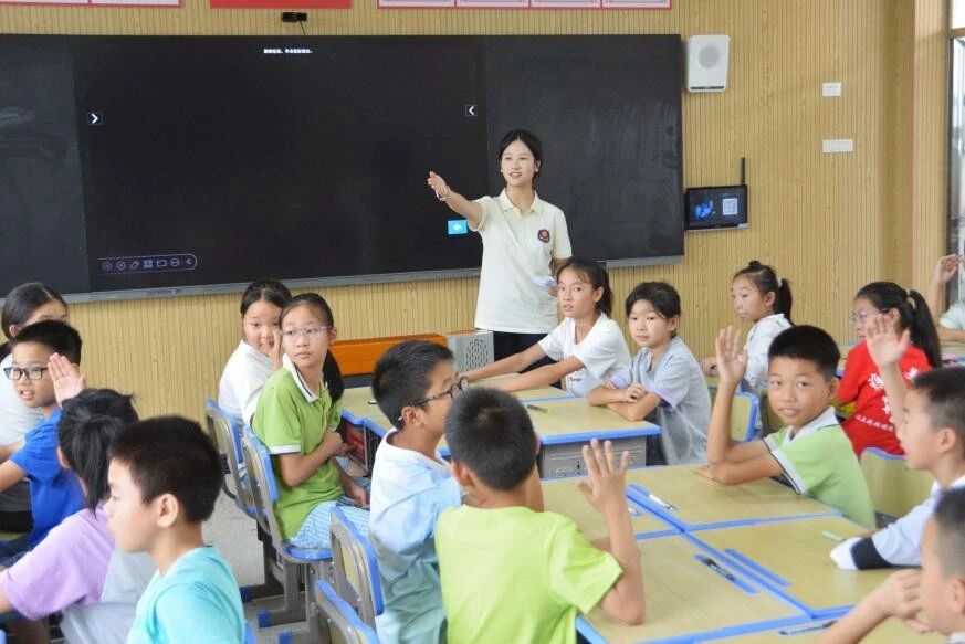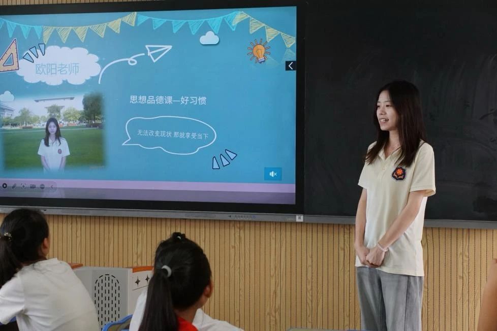 思想品德课上,“欧阳老师”欧阳雪通过生动的案例和互动讨论,引导孩子们树立正确的价值观和道德观,培养他们的良好品德和行为习惯。