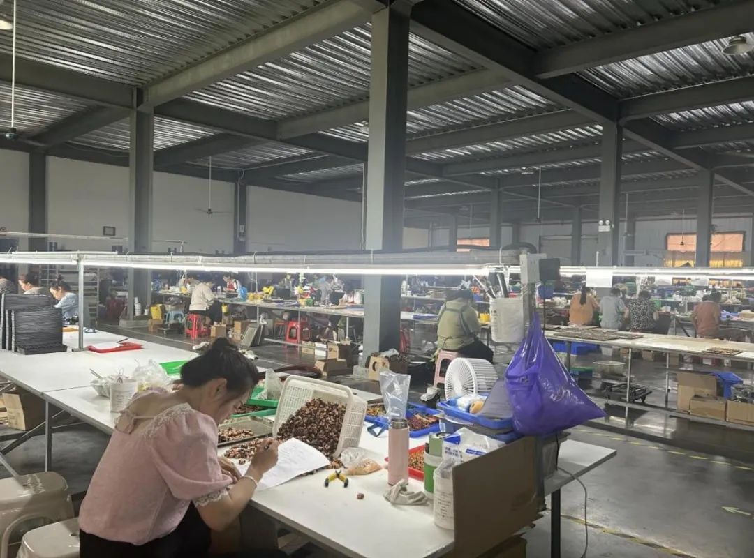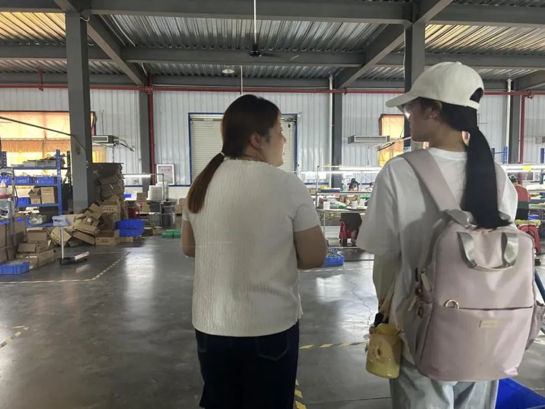 在工厂负责人的带领下,团队成员参观了生产车间与办公区域。我们直观地感受到了企业的生产运营氛围和办公环境。负责人带领团队观看了磁环绕线圈、预切脚、焊锡、穿底板、点胶、进烤箱烘烤、成品切脚、阿肯测试、耐压测试、成品测试、外观检测、成品包装、出货等工序的进行。各区域分工明确、有条不紊。其中,工厂中还配备有教习人员对尚未熟悉工作内容的员工进行指导。这种做法不仅降低了员工的错误率,还营造了团结、友好的工作氛围,提高了员工的生产积极性,从而提高了产业的产出率。正是因为员工们的细致认真,才会有越来越多高质量的零部件从农村流向城市。在与工厂负责人的交流中,负责摄影的团队成员何其佳说:“以前总觉得中国制造是一个很宏大的概念,现在发现它就藏在每一个零件、每一道工序、每一位劳动者的双手里。”