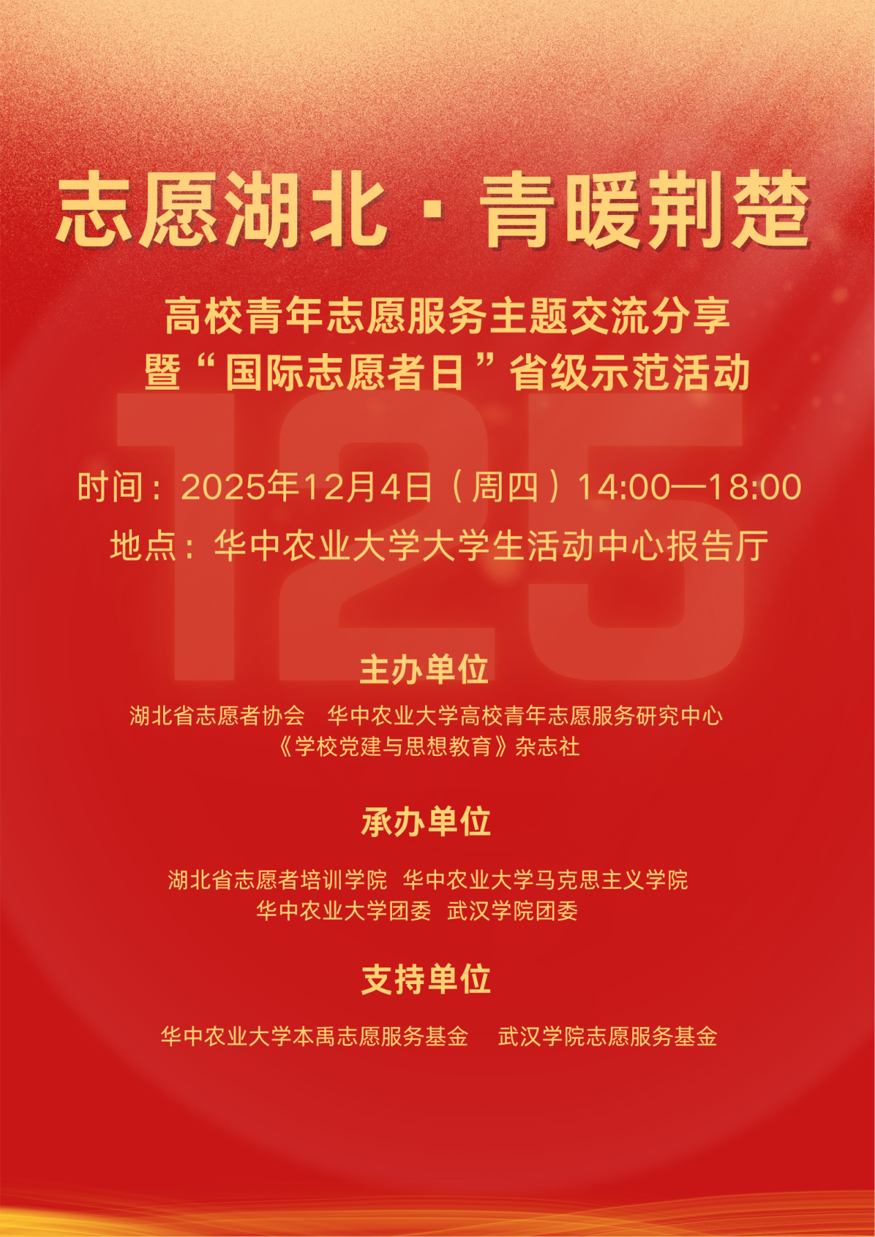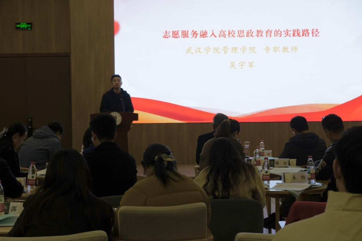 12月4日,由湖北省志愿者协会、华中农业大学高校青年志愿服务研究中心、《学校党建与思想教育》杂志社联合主办,武汉学院团委等单位共同承办的“志愿湖北·情暖荆楚”高校青年志愿服务主题交流分享暨“国际志愿者日”省级示范活动在华中农业大学隆重举行。来自中国青年报、湖北省社会科学院、团省委、华中科技大学、武汉理工大学、华中农业大学、湖北省团校等单位的知名专家学者参会。我校管理学院吴宇军老师作为民办高校代表受邀参加大会并作主题分享报告。