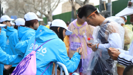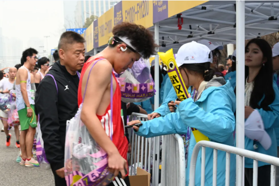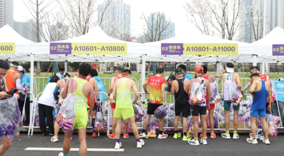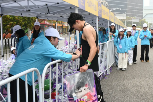 “恭喜完赛!您辛苦了——来,这是您的包,请核对一下。”当计时芯片踩过终点拱门,志愿者早已在存取衣区守候多时。快速核对、高效查找、准确递送——这不是流水线作业,是对几个小时前那句“终点见”的履约。“你负责乘风破浪,我负责让你的外套和钥匙,安全抵达。”志愿者们以严谨守护赛事运转,用专注为每一位拼搏的跑者撑起最可靠的后方。