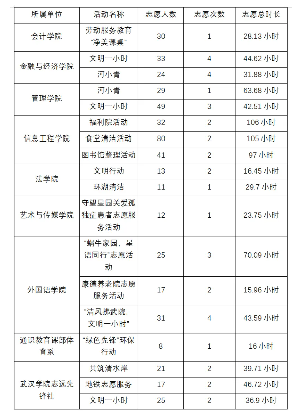 三月春风虽逝,志愿精神长存。为深入践行雷锋精神,武汉学院于三月期间全面开展“学雷锋志愿服务月”系列活动。全校青年学子踊跃参与,累计1154人次投身志愿服务,贡献志愿时长5469.97小时,用实际行动将雷锋精神内化于心、外化于行,让奉献之花在春日武院绚烂绽放。